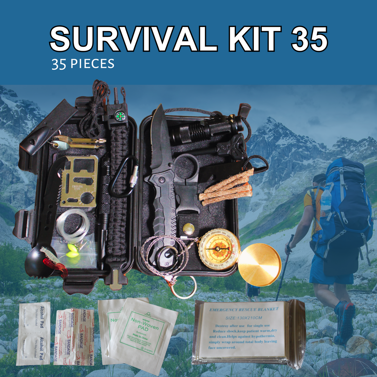 Whether you're adventure-seeking or facing a survival situation, the SURVIVAL KIT 35 is a must-have for your camping and outdoor needs. Loaded with all the essentials you need to stay alive and enjoy the outdoors, this kit offers the perfect combination of safety and adventure - all in one! Make sure to be prepared in any situation - get the SURVIVAL KIT 35 today!
